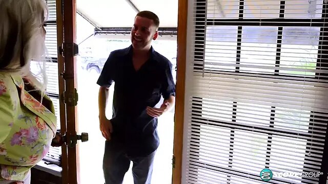 Dressed in a sexy blouse, mature blonde girl Sally waits at home for some bum-banging. She's an older, old wife but her big boobs don't lie. A younger guy shows up and pounds her tits while she moans, ending with a cumshot all over her beautiful cleavage.